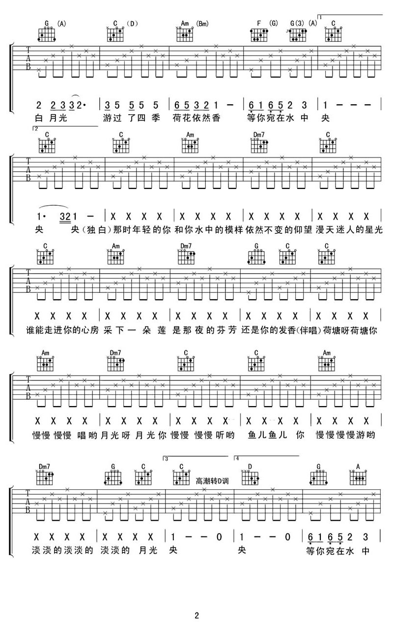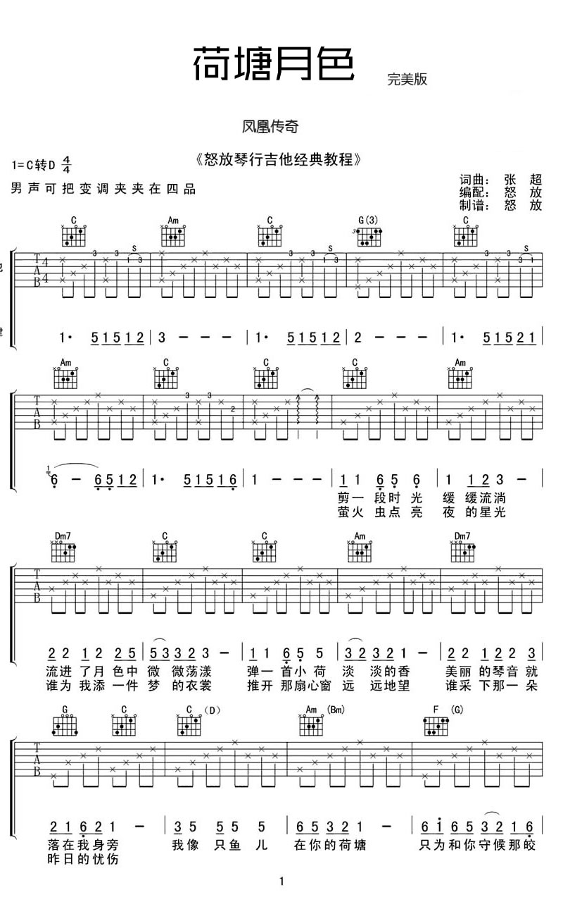 凤凰传奇荷塘月色吉他谱,简单高清原版指弹曲谱,凤凰传奇高清六线乐谱