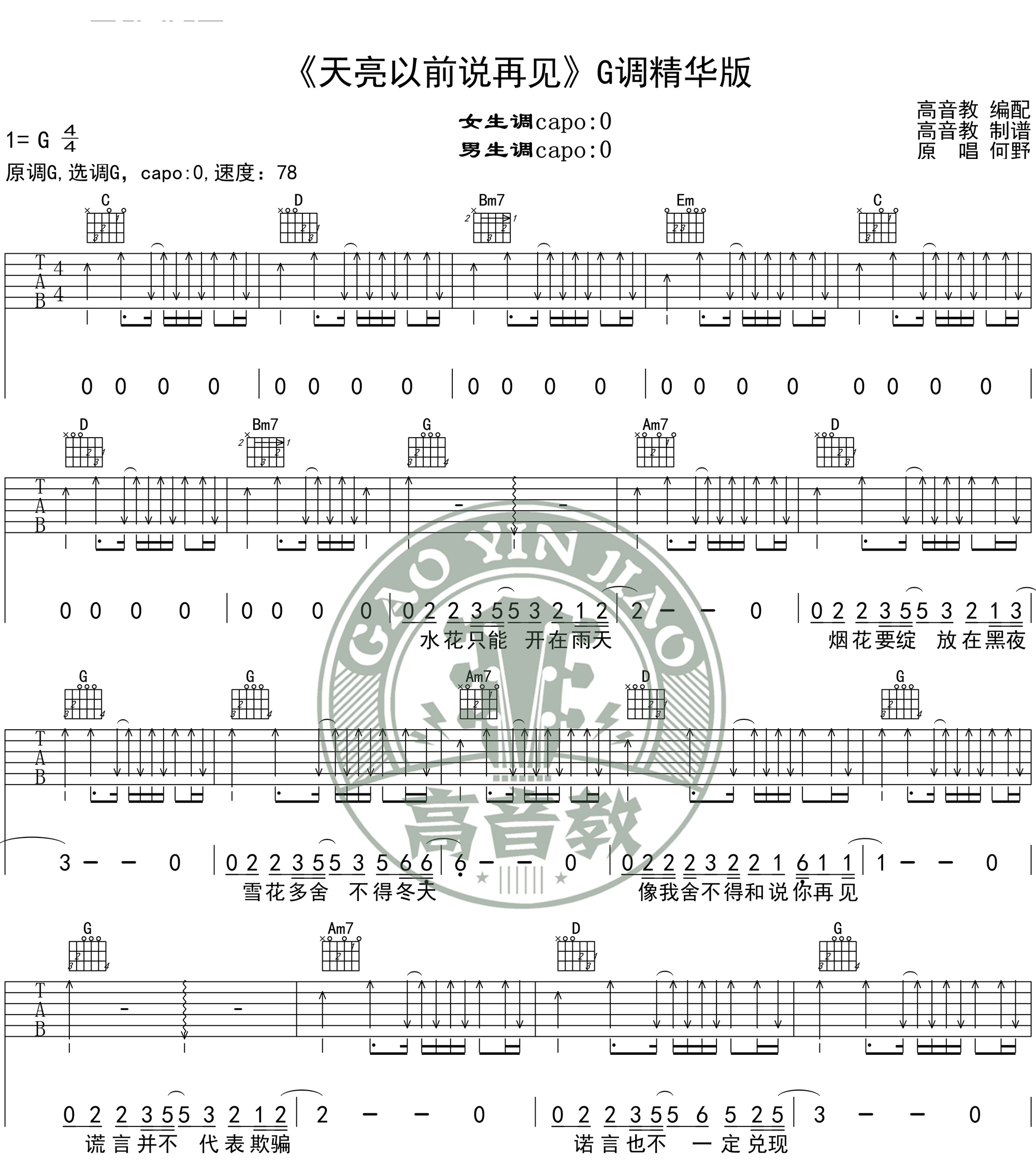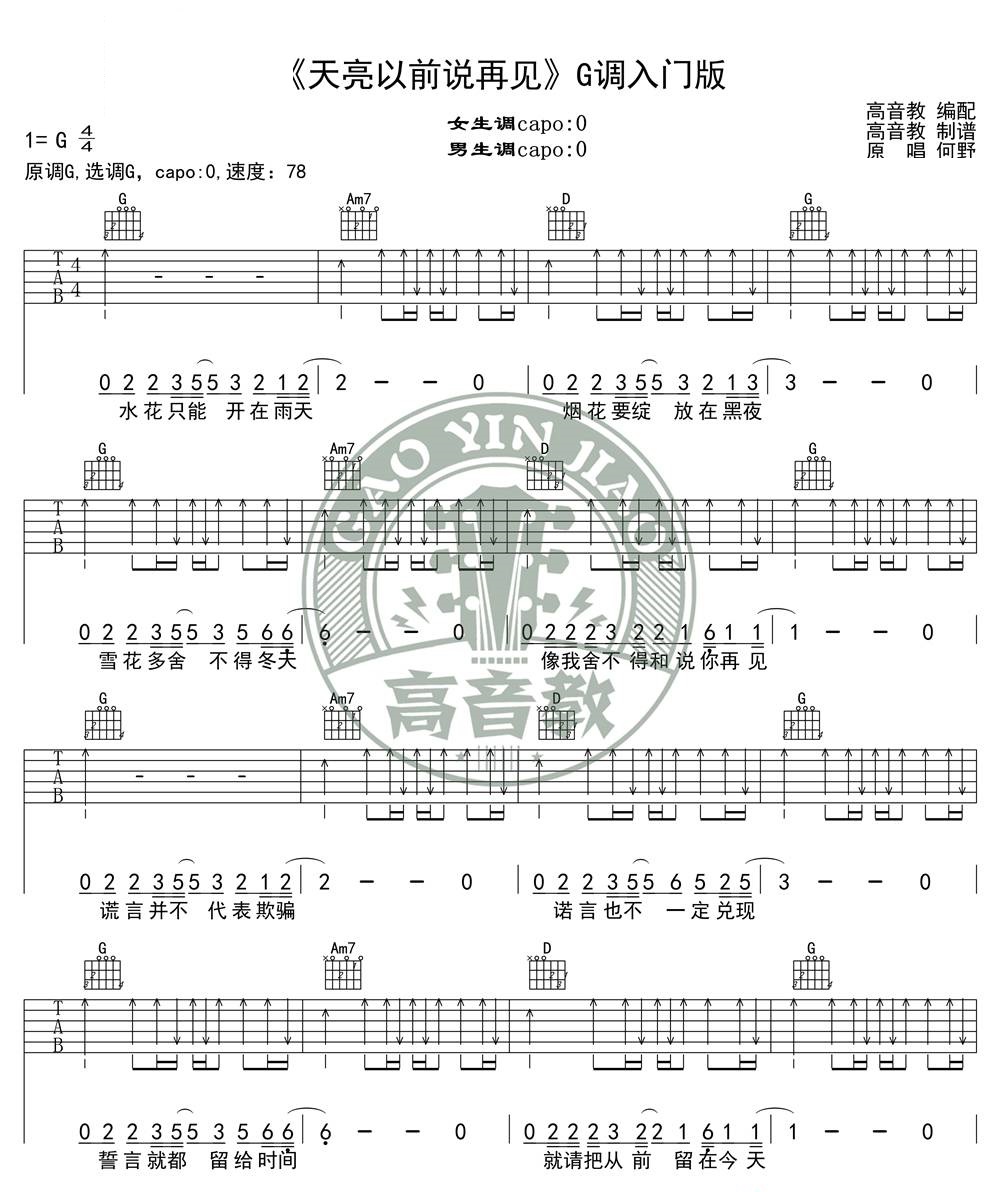 《天亮以前说再见吉他谱》_何野_G调 图一