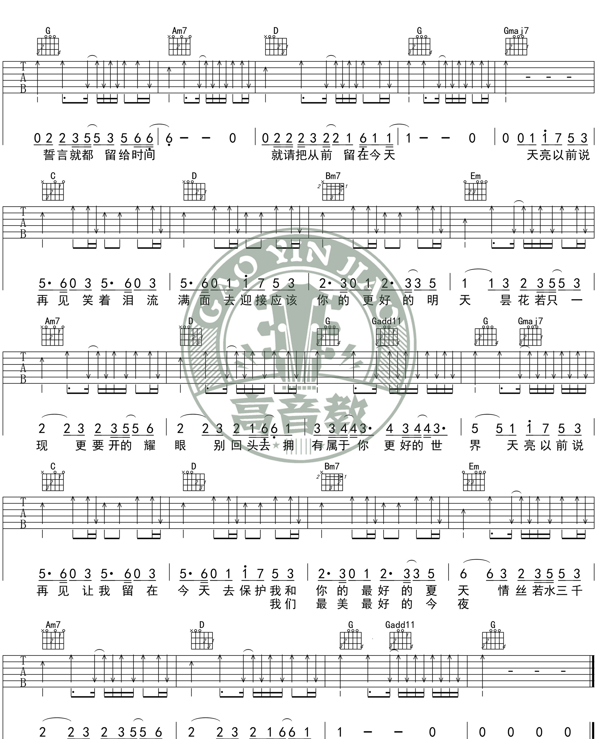 天亮以前说再见吉他谱,原版歌曲,简单G调弹唱教学,六线谱指弹简谱4张图