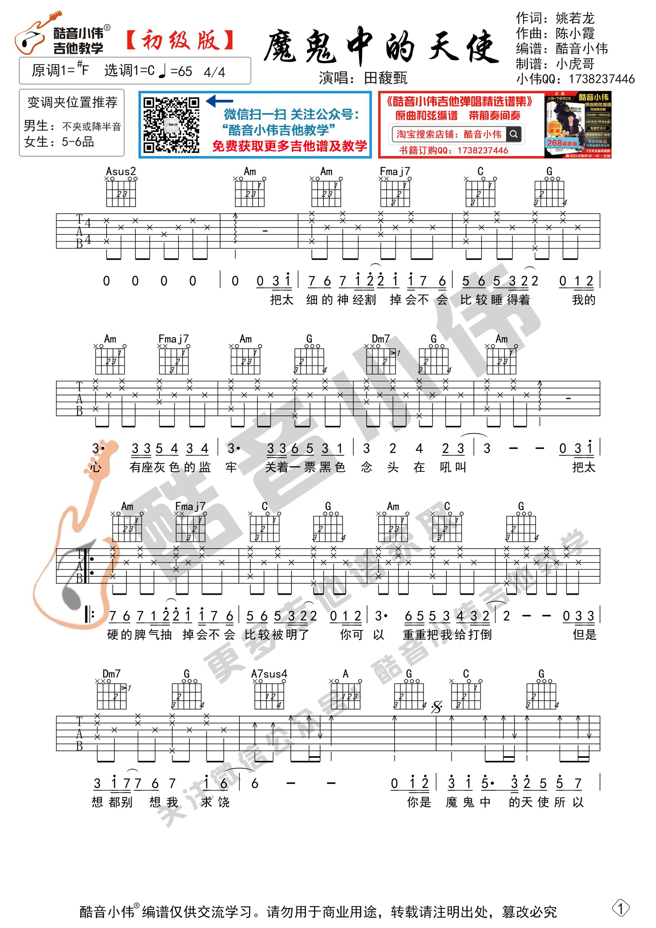 以上就是4/4节拍C调版的魔鬼中的天使弹唱简谱完整内容,希望这个简单六线高清图片教学谱能帮到您,也希望您能收藏本站,这里每天源源不断更新各种简单入门曲谱。